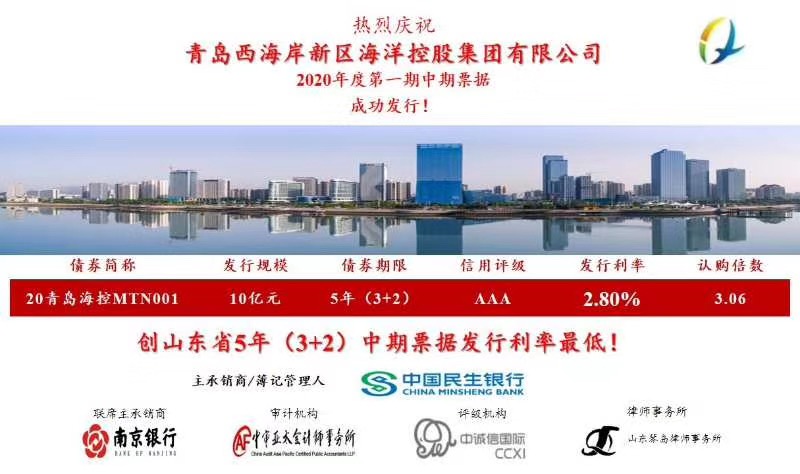 近日,海控集团2020年第一期中期票据在银行间交易市场成功发行,发行金额10亿元,期限5(3+2)年,发行利率2.80%,创山东省国有企业同期限中期票据发行票面利率最低。此次中期票据的成功发行,是海控集团与民生银行战略合作的成果,同时作为海控集团首次在公开市场亮相,受到资本市场高度关注,有助于提升海控集团发展实力和资本市场认可度,为服务经略海洋战略发展奠定基础。